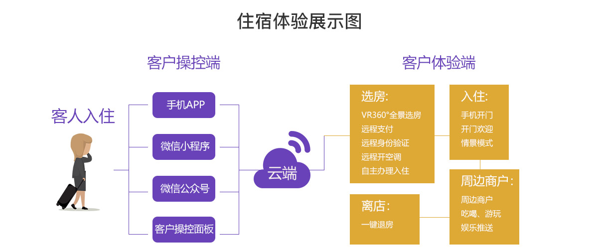 智慧酒店方案融合自動化控制系統、移動互聯網、物聯網和網絡通訊技術于一體,為客人提供從入住到退房一整套的酒店入住解決方案。