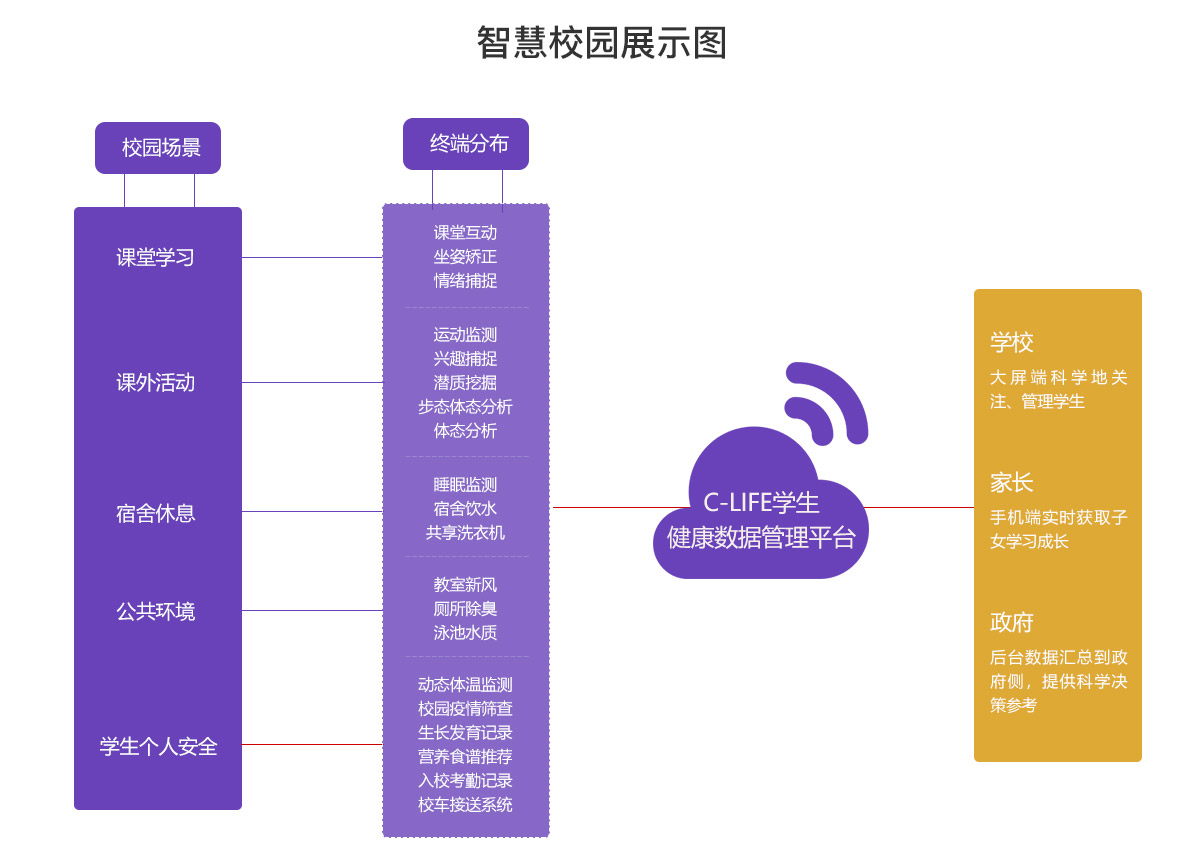 智慧校園管理平臺由是分布在校園內的物聯網數據采集終端搭建的一種可感知、可診斷、可分析、可自愈、基于健康、安全、教育、環境、管理等多維一體的移動互聯的新型校園生態。數據采集終端將校園學習生活的各個場景激活,記錄學生在學校學習、生活的數據,并通過對多維度的計算、深度分析,建立精準的學生健康成長模型。并將這些數據共享給家長、學校、政府,三位一體,共同關注學生健康成長。